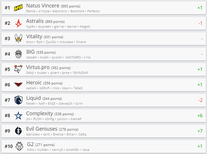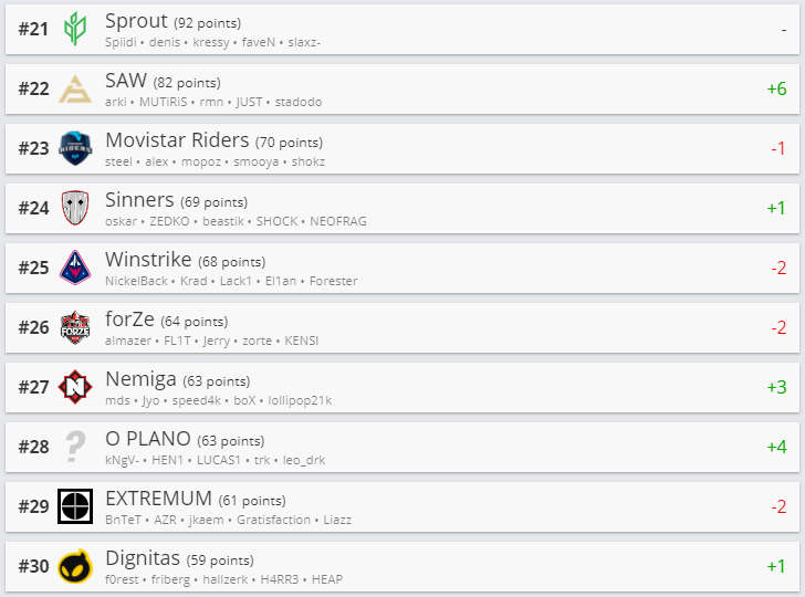 Белорусская команда Nemiga Gaming прибавила 3 позиции и расположилась на 27-ой строчке. Первое место заняли NaVi, а пятое — Virtus.pro.