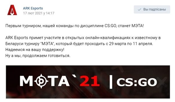 Состав по CS:GО белорусской организации ARK Esports примет участие в открытых онлайн-квалификациях турнира МЭТА’21 Open, который пройдет с 29 марта по 11 апреля. Об этом сообщается в группе команды. Это будут первые соревнования для клуба.