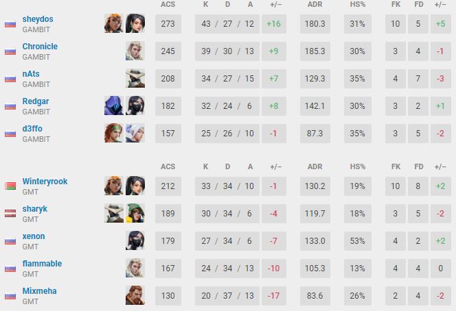 Команда GMT, за которую выступает белорус Евгений WinteryRook Ленько, уступила в полуфинале VALORANT Champions Tour 2021: CIS Stage 1 Masters коллективу Gambit. Счет — 0:2. Проигравшие заработали $7 500 и 45 очков, которые будут подсчитываться при квалификации на чемпионат мира.