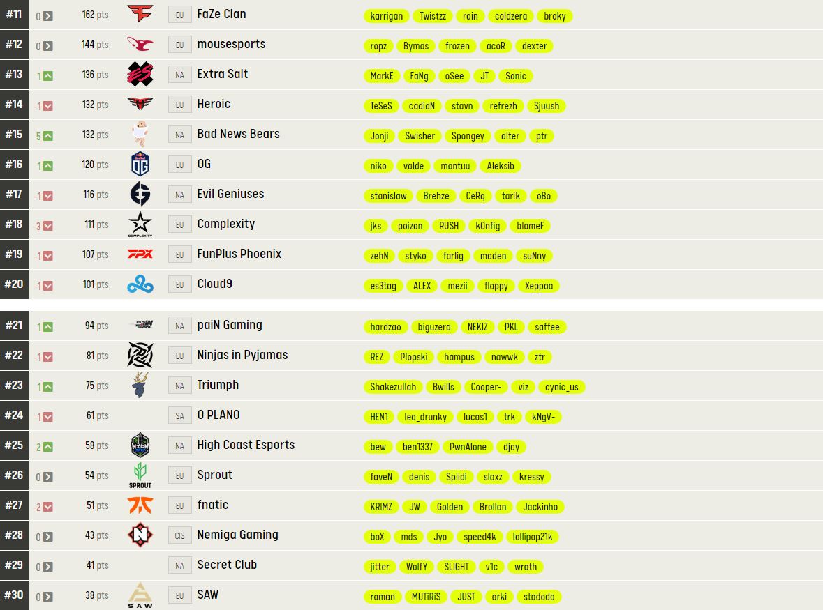При этом российский клуб Gambit Esports обогнал лидера рейтинга Astralis. Команда хорошо себя показала в последнее время: коллектив одержал победу на Intel Extreme Masters Katowice 2021, а также занял первое место в своей группе с результатом 4-0 на ESL Pro League.