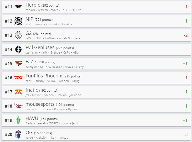 Белорусская команда Nemiga Gaming прибавила 2 позиции и расположилась на 27-ой строчке. Первые два места остались без изменений, а на третью строчку поднялась Gambit Esports, сместив с этой позиции Virtus.pro.