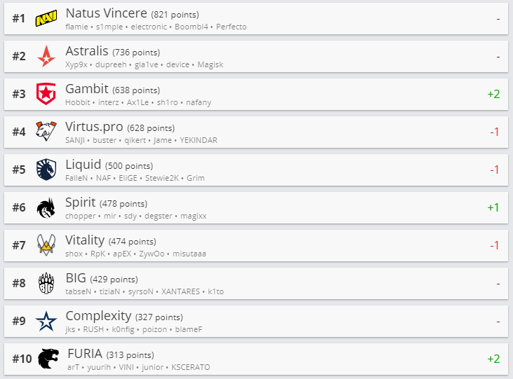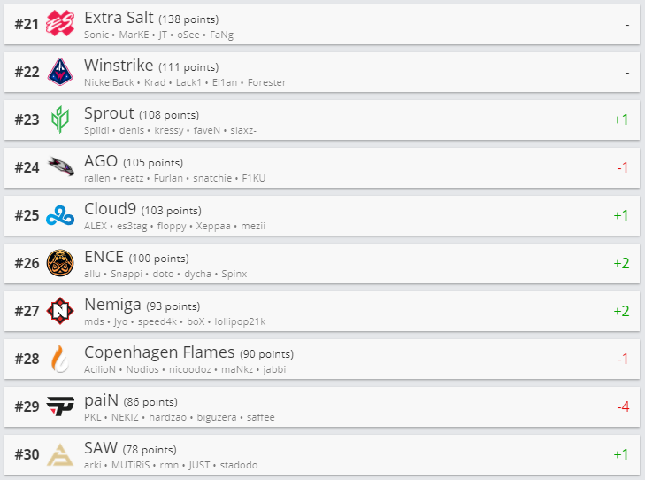 Белорусская команда Nemiga Gaming прибавила 2 позиции и расположилась на 27-ой строчке. Первые два места остались без изменений, а на третью строчку поднялась Gambit Esports, сместив с этой позиции Virtus.pro.