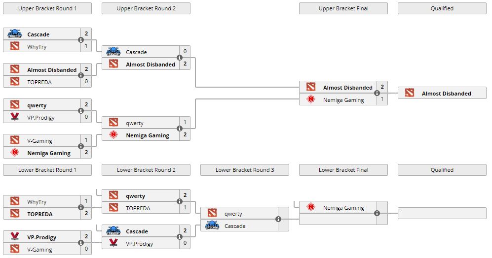 В финале верхней сетки закрытых квалификаций во второй дивизион DPC-лиги для СНГ Nemiga Gaming уступила команде Almost Disbanded со счетом 1:2. Команда еще имеет шанс получить заветное место, 21 марта в 17:00 пройдет финал нижней сетки, где белорусский коллектив сразится с победителем пары qwerty и Cascade.