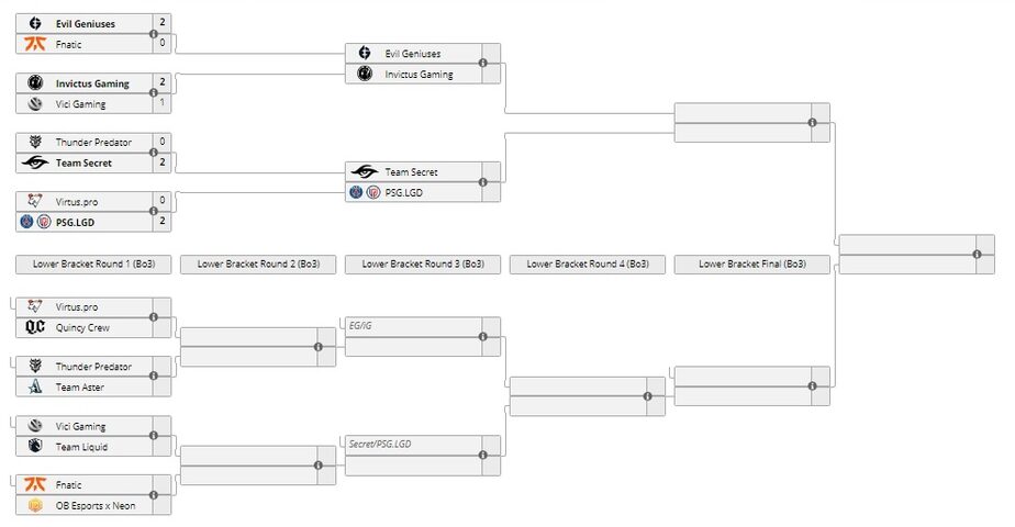 В нижней сетке Virtus.pro встретится с коллективом Quincy Crew, а PSG.LGD столкнётся лицом к лицу с Team Secret. Поединки пройдут 1 и 2 апреля соответственно.