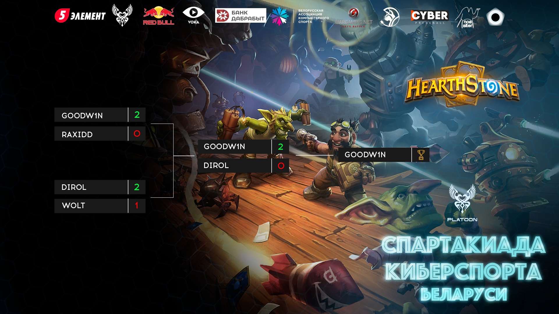 Завершился отборочный этап Спартакиады киберспорта Беларуси по дисциплине Hearthstone в Гомельской области. Победителем стал Гоша GODWIN Гарбузов. Он станет участником общереспубликанского группового этапа.