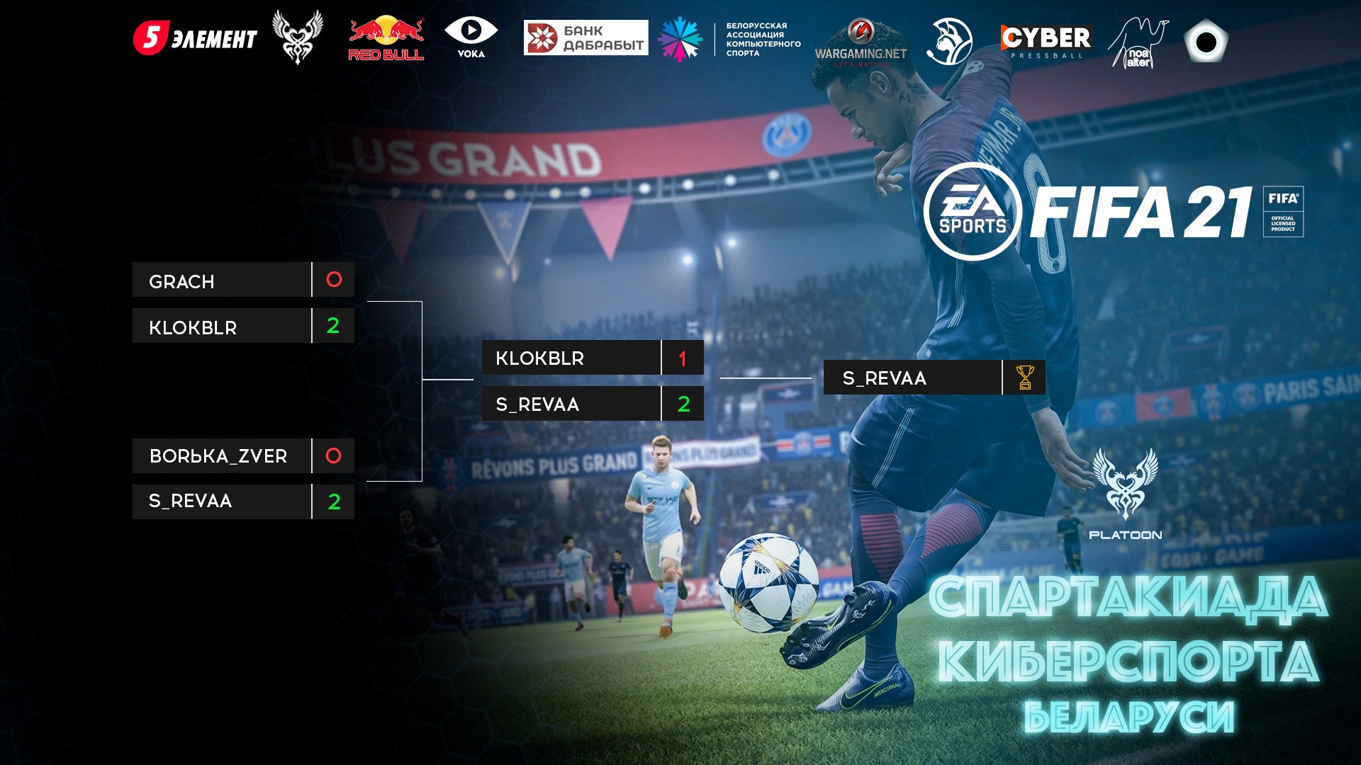 Игрок с ником S_Revaa стал победителем отборочного этапа Спартакиады киберспорта Беларуси по дисциплине FIFA 21 для Гомельской области. В финале со счетом 2:1 был обыгран KlokBLR. Теперь S_Revaa представит свой регион в общереспубликанской групповой стадии, которая пройдет с 7 – 9 мая.