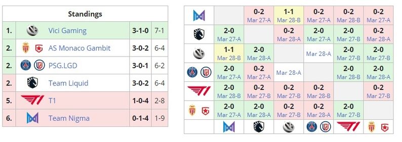 На этой стадии турнира остался последний матч: PSG.LGD — Vici Gaming. Для аутсайдеров Мейджор завершен: Nigma не смогла добыть ни одной победы. Команду Kyroky проиграла в четырех встречах и одну завершила в ничью. T1 в четырых матчах уступили и в одном победили. Оба коллектива едут домой. По результатам сыгранных матчей Vici Gaming прошли в групповой этап. После заключительного матча стадии станет понятно, сколько команд будут участвовать в переигровках.