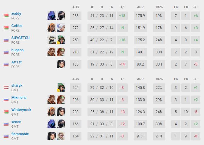 Команда forZe, за которую выступают белорусы Никита coffee Анцыпирович и Николай zeddy Лапко обыграла GMT Esports, в составе которой также белорусский игрок Евгений WinteryRook Ленько, в полуфинале VALORANT Champions Tour 2021: CIS Stage 2 Challengers 1 со счетом 2:0.