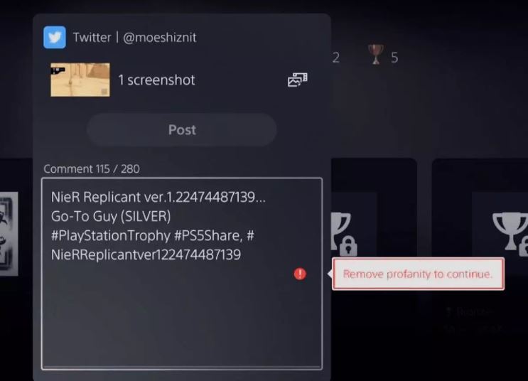 Из за того, что полное название игры — NieR Replicant ver.1.22474487139… , где “.1.” понимается приставкой как эмодзи пениса, сообщение в социальную сеть блокируется. В итоге отправить скриншот просто невозможно.