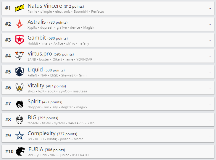 Традиционно в начале недели ресурс HLTV.org обновил рейтинг лучших коллективов мира в CS:GO.