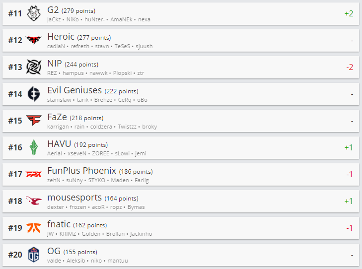 Белорусская команда Nemiga Gaming потеряла 4 позиции и теперь размещается на 30-ой строчке рейтинга. В десятке сильнейших никаких изменений не произошло.