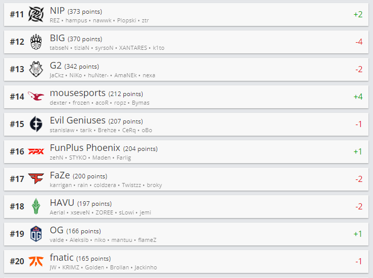 Белорусская команда Nemiga Gaming покинула топ-30 рейтинга и теперь располагается на 33-ей строчке. Первое место заняла Gambit Esports. Это вторая команда из СНГ после NaVi, которой удалось занять первую строчку в еженедельном рейтинге.