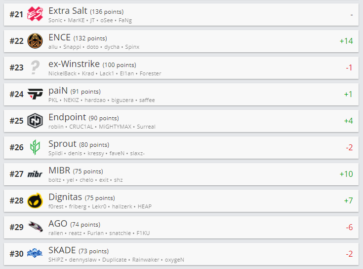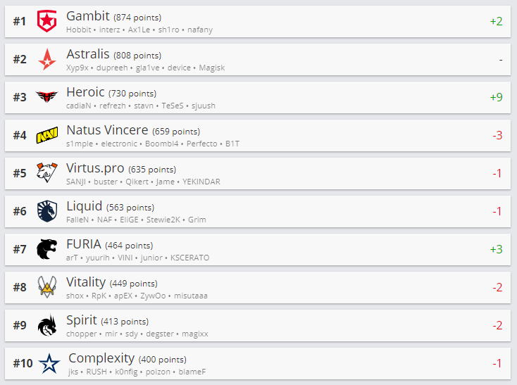 Белорусская команда Nemiga Gaming покинула топ-30 рейтинга и теперь располагается на 33-ей строчке. Первое место заняла Gambit Esports. Это вторая команда из СНГ после NaVi, которой удалось занять первую строчку в еженедельном рейтинге.