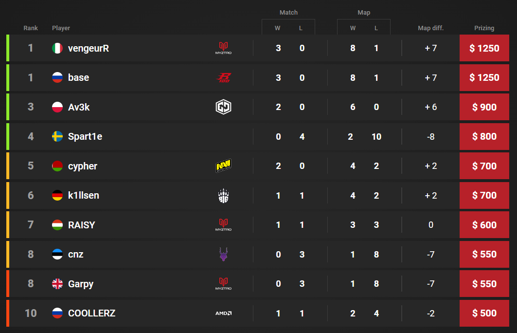 В рамках третьей стадии Quake Pro League Season 2 победа на каждой карте приносит спортсмену $150, за поражение полагается $50. По итогам встреч белорус уже заработал $700.