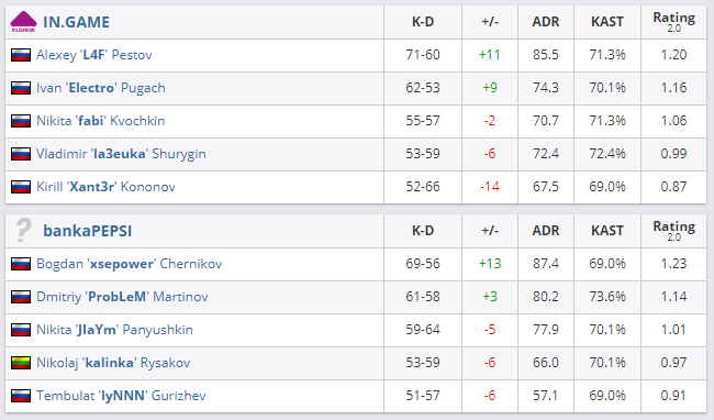 Коллектив bankaPEPSI обыграл IN.GAME в рамках матча 2 ранда EPIC CIS League со счетом 2:1. На данный момент bankaPEPSI с результатом 1-1 по играм поднялась на 9 место, а IN.GAME со вторым поражением подряд осталась на последнем.