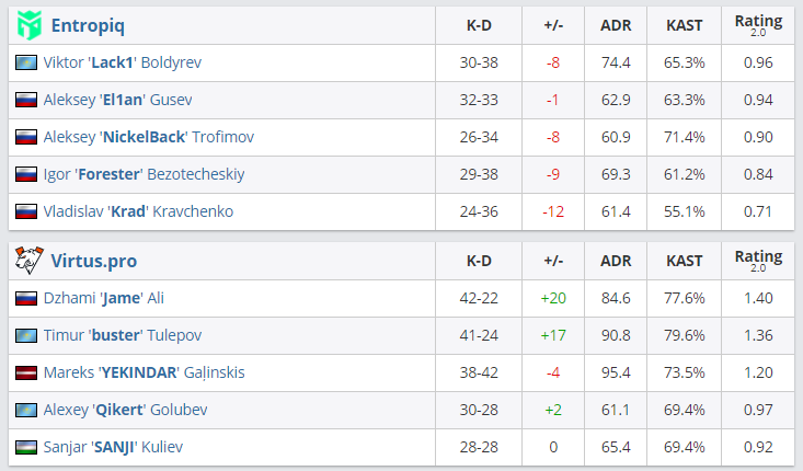 В матче нижней сетки плей-офф EPIC CIS League Spring 2021 Entropiq со счетом 0:2 проиграла Virtus.pro и покинула турнир. Следующим соперником “медведей” станет победитель встречи Team Spirit и Natus Vincere.