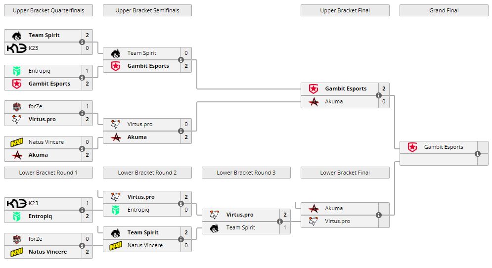 Gambit со счетом 2:0 обыграла Akuma и вышла в гранд-финал EPIC CIS League. Проигравшие получат второй шанс пробиться в решающий матч-турнира. Для этого им нужно переиграть Virtus.pro 30 мая.