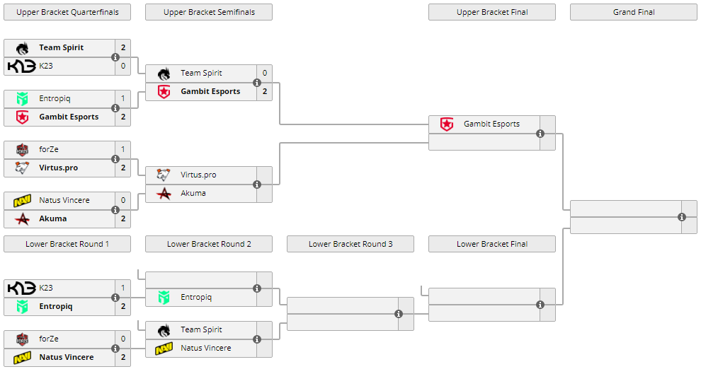 Gambit прошла в финал верхней сетки, матч c победителем пары Virtus.pro и Akuma назначен на 29 мая в 17:00.