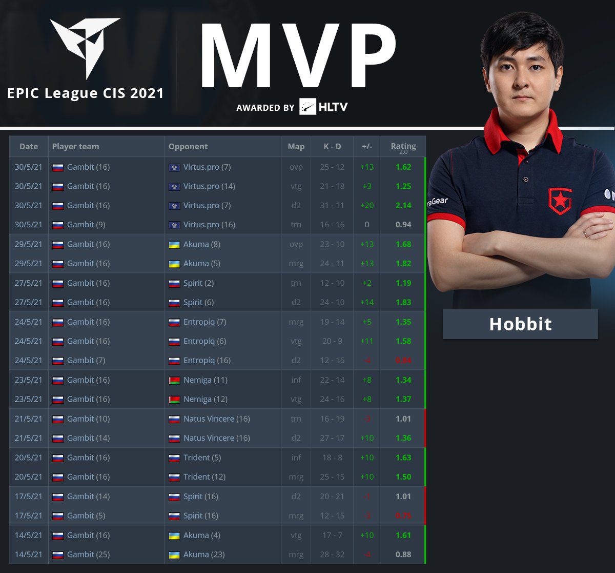 Абай HObbit Хасенов из состава Gambit Esports по CS:GO был признан самым ценным игроком турнира по итогам EPIC CIS League Spring 2021 порталом HLTV.org. Это второй титул MVP в карьере киберспортсмента. Прошлый он заработал за DreamHack Winter 2016.