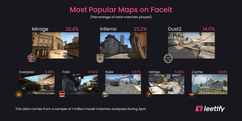 Платформа leetify опубликовала рейтинг самых популярных карт матчмейкинге CS:GO. Лидером стала Mirage, ее выбрали более 31.4% игроков, второе место заняла Dust2 c 19.4%, а на третьей строчке расположилась Inferno c 18.8%.
