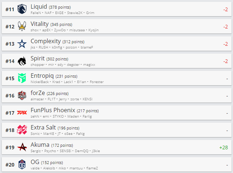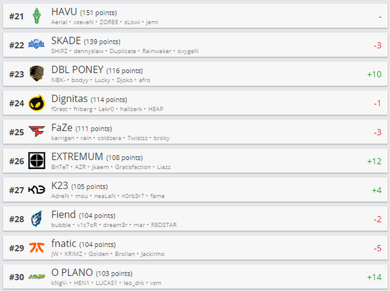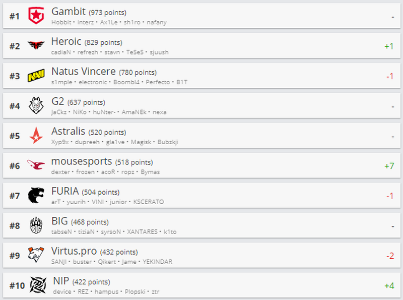 В уже стандартной тройке лидеров произошли небольшие изменения: Natus Vincere уступила третью строчку коллективу Heroic. На первом месте же продолжает доминировать Gambit.