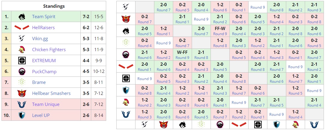 Team Spirit вынуждена пропустить встречу с PuckChamp из-за того, что представители команды в данный момент едут в Киев, на место проведения Animajor. Дружине белоруса Astral засчитана техническая победа со счётом 2:0. “Лесные дракончики” располагаются сейчас на шестом месте в таблице. В случае поражений Brame и Hellbear Smashers команда гарантированно займёт место в плей-офф.