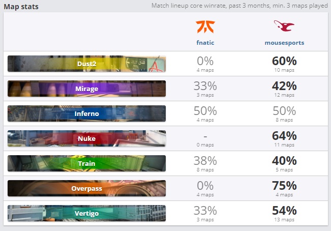Поэтому придётся зайти на европейский CS:GO. Mousesports идут фаворитами, на них предлагают коэффициент 1.5. На fnatic коэффициент 2.48. В последние месяцы шведы играли очень мало и не совсем ясна их форма. По мап-пулу за последних три месяца видно тотальное превосходство “мышей”.