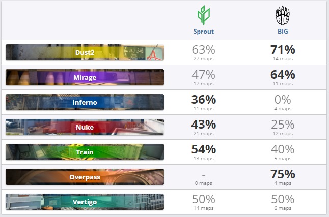 Обратим внимание, что три последних личных встречи забирали ребята из Sprout, да это было довольно давно — последняя из них ещё в январе, но все же. Плюс, тут важен фактор того, что игроки Sprout хотят доказать, что именно они — главная немецкая команда и поэтому будут играть на все сто процентов. Да и по маппулу видно что тут может быть заруба — к сигнатурному Dust ребята из Sprout вполне себе готовы.