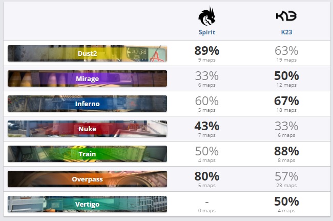 В этом противостоянии наш партнёр Parimatch выделяет фаворитом команду Spirit. На их победу дают 1.15. На викторию К23 дают 5.00. Spirit демонстрируют феноменальную форму. В групповой стадии, проходящей по швейцарской системе, ребята выиграли три матча из трёх, не отдав при этом ни одной карты. А ведь в оппонентах были Gambit и Entropiq. Выход K23 в стадию плей-офф стал причиной везения с сеткой.