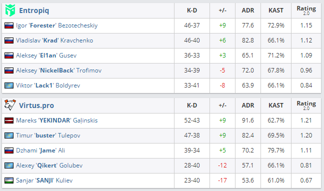 Коллектив Virtus.pro уступил Entropiq в заключительном матче четвертого раунда EPIC CIS League со счетом 0:2. “Виртуса” опустились на 7 место с результатом 2-2, а Entropiq с итоговым счетом 3-1 отправилась в плей-офф.
