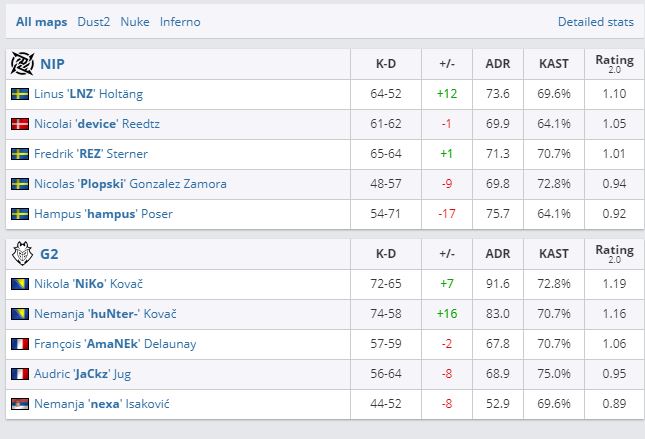 В рамках турнира BLAST Premier: Spring Finals 2021 по CS:GO команда G2 Esports сразилась с коллективом Ninjas in Pyjamas и победила со счетом 2:1. Коллективы играли на картах: Dust2 (11:16), Nuke (16:13) и Inferno (17:19).