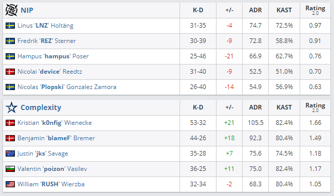 Коллектив Complexity обыграл команду Ninjas in Pyjamas в матче верхней сетки BLAST Premier: Spring Finals 2021 со счетом 2:0. Complexity прошла в полуфинал к Gambit, а “Ниндзя” опустились в нижнюю сетку.