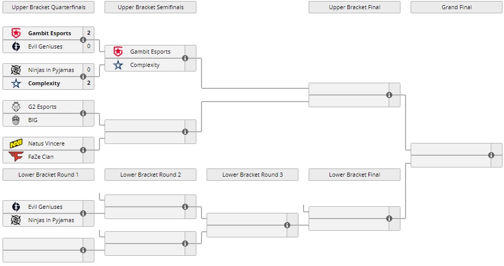 А в 19:30 будет сыгран матч на вылет. Evil Geniuses будут играть против Ninjas in Pijamas. За ходом игру можно следить здесь.