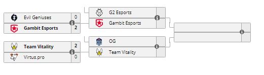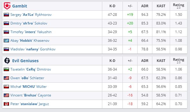 Состав Gambit Esports встретился с Evil Geniuses. Российская команда победила со счетом 2:0. Коллективы играли на картах Dust2 (16:10) и Overpass (16:11).