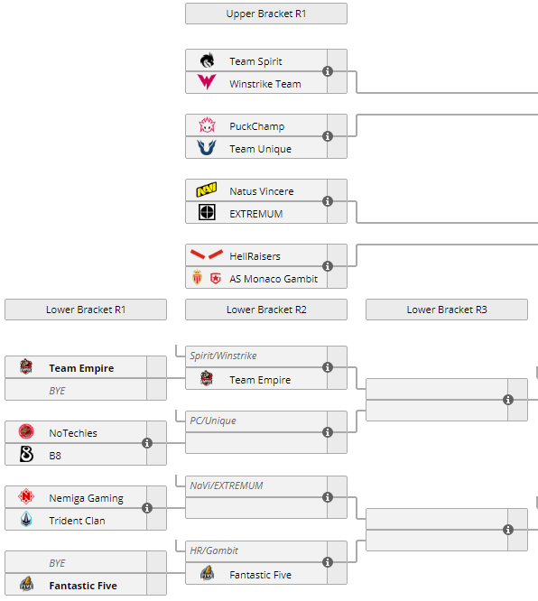 Теперь в первом раунде нижней сетки Nemiga Gaming сыграет против Trident Clan. А вместо распущенной команды Prosti Esli с B8 встретится NoTechies. Fantastic Five в этой ситуации и вовсе автоматически прошла во второй раунд.