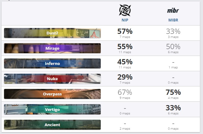 В этом противостоянии наш партнёр Parimatch считает Ninjas in Pijamas фаворитами, на них предлагают коэффициент 1.15. На MiBR коэффициент 5.00. MiBr вчера проиграла со счётом 2:0 команде Iberian Family. Сейчас проигрывают без шансов команде Lungby Vikings. NiP же команда уровня гораздо выше и у них не должно возникнуть проблем с бразильцами, непрошедшими акклиматизацию.