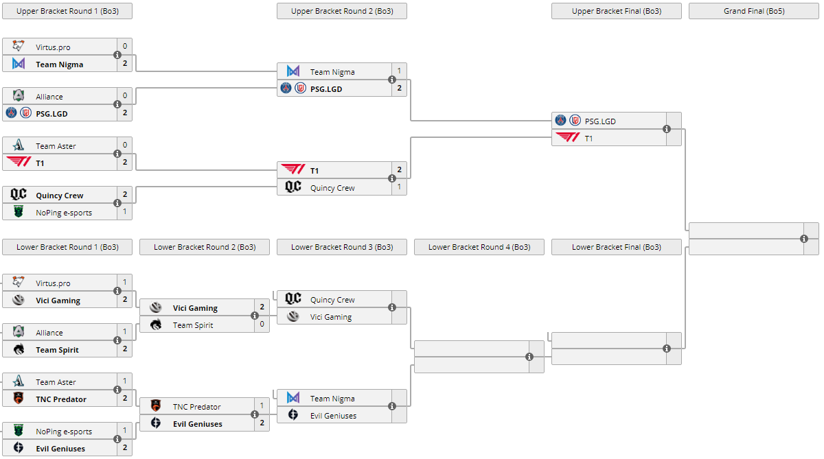 QC опустилась в нижнюю сетку к Vici Gaming, матч назначен на 12 июня в 15:00. А T1 прошла в финал верхней сетки, где встретится с PSG.LGD 12 июня в 21:00.