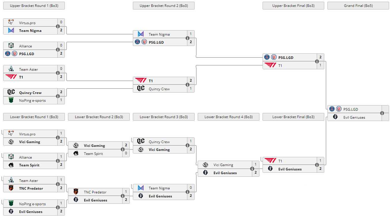 В финале нижней сетки плей-офф WePlay AniMajor 2021 Evil Geniuses со счетом 2:1 обыграли T1 и вышли в гранд-финал турнира, где встретятся с PSG.LGD. Посмотреть матч можно на нашем сайте.