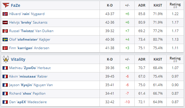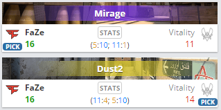 Vitality выбыла с соревнования, а FaZe прошел в финал нижней сетки, где встретится с победителем пары Heroic и FURIA сегодня в 21:00.