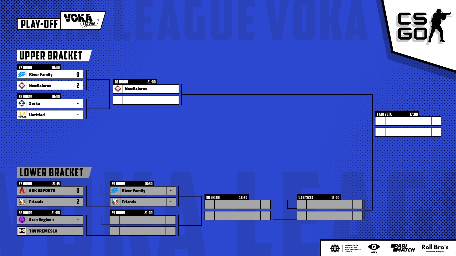 Сегодня, 28 июля, пройдет второй день плей-офф VOKA League Season 4 по CS:GO. Все матчи пройдут до двух побед по системе Double Elimination (с верхней и нижней сеткой).