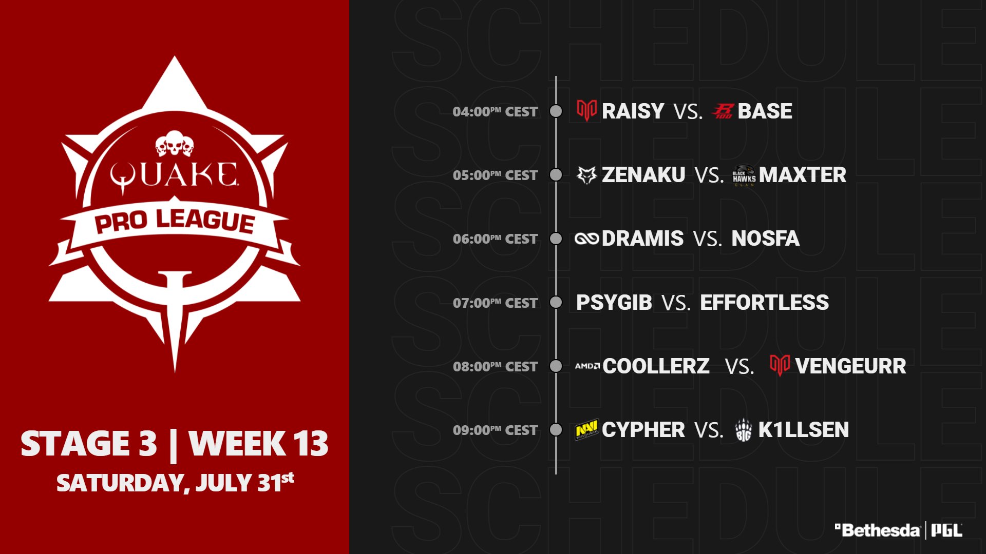 Quake Pro League Season 2:Stage 3 проходит с 9 мая по 30 июля. 20 игроков со всего мира разделены на две группы. Общий призовой фонд турнира – $54 тыс.