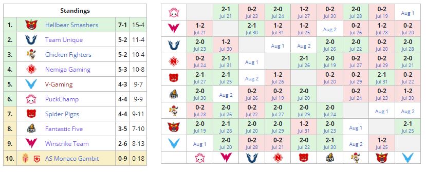 Nemiga занимает четвертое место (5-3) и будет бороться за выход в верхний дивизион плей-офф. Состав Winstrike Team занимает девятую строчку (2-6).