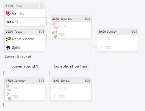 В 17:00 начнется противостояние K23 – Gambit, а в 20:00 сыграют Natus Vincere – Team Spirit. Победители встретятся в финале верхней сетки, проигравшие продолжают борьбу за выживание в корзине лузеров.