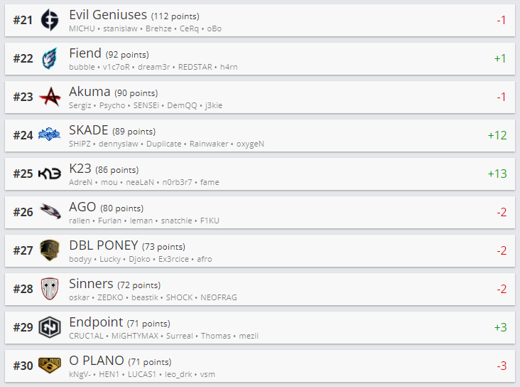 В топ-10 существенных изменений не произошло. Главный прорыв недели — К23. Казахстанская команда прибавила 13 позиций и расположилась на 25-ом месте. Nemiga Gaming тоже поднялась в рейтинге, и теперь находится на 45-ой строчке.