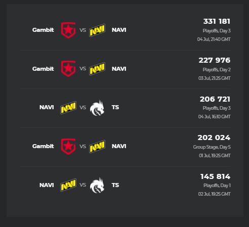 Самым просматриваемым матчем стал финал между Natus Vincere и Gambit. Поединок посмотрели 331 181 человек. Второе место по просматриваемости также у этих коллективов. Встречу верхней сетки плей-офф за выход в гранд-финал посмотрели на 100 тыс зрителей меньше — 227 976.