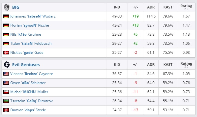 Команда BIG обыграла Evil Geniuses со счетом 2:0 в матче группового этапа ESL Pro League Season 14. В следующем раунде немецкий коллектив сыграет с Fnatic. А американцы померяются силами с FaZe Clan. Оба матча пройдут 28 августа.