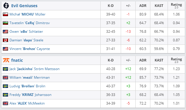Коллектив Fnatic переиграл Evil Geniuses в матче группы “C” ESL Pro League. Счет — 2:0. Команды встречались на Nuke — 16:11 и Inferno — 16:14.