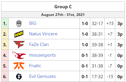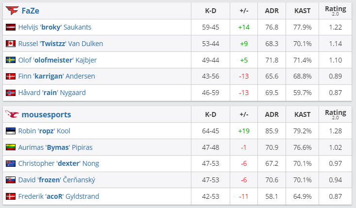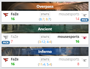 В рамках третьего матча группы “C” четырнадцатого сезона ESL Pro League FaZe Clan со счетом 2:1 обыграли mousesports. На первой карте (Overpass) счет — 16:14, на второй (Ancient) — 7:16, на третьей (Inferno) — 16:8.