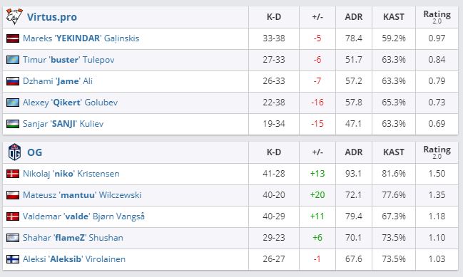 В матче группы “B” четырнадцатого сезона ESL Pro League Virtus.pro уступили OG — 0:2. На карте Mirage европейцы оказались сильнее со счетом 16:11, а на Dust2 игра завершилась при цифрах 16:6.