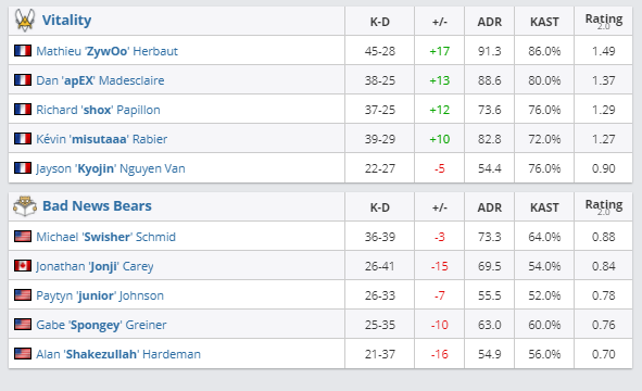В матче группы “А” четырнадцатого сезона ESL Pro League Vitality победила Bad News Bears — 2:0. Коллективы встречались на Inferno и Overpass. Обе карты были закончены со счетом по раундам 16:9.